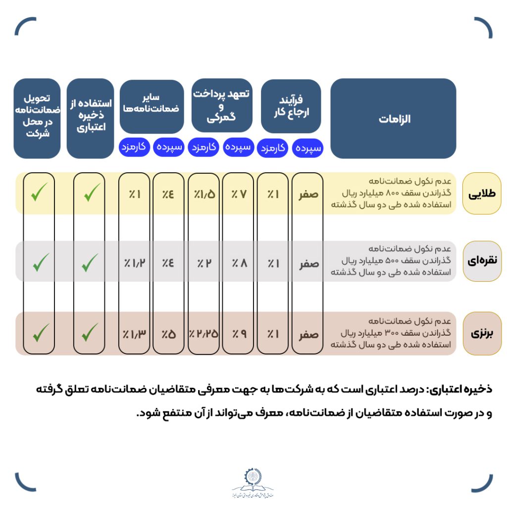 طبق مصوبه جدید هیئت مدیره صندوق البرز، مشتریانی که به ترتیب ۳۰۰،۵۰۰ و ۸۰۰ میلیارد ریال ضمانت نامه از صندوق البرز دریافت کنند به ترتیب به مشتریان برنزی، نقره ای و طلایی تبدیل خواهند شد.